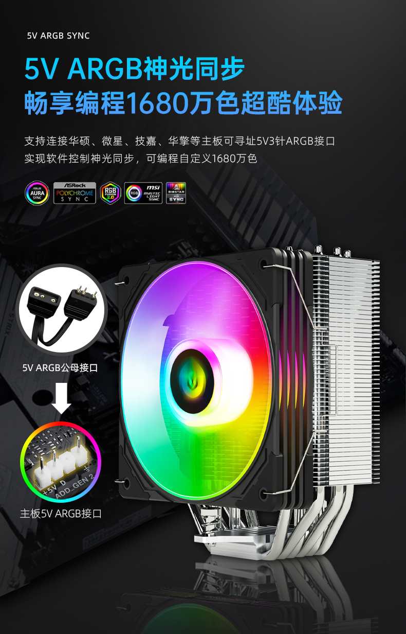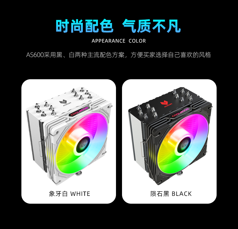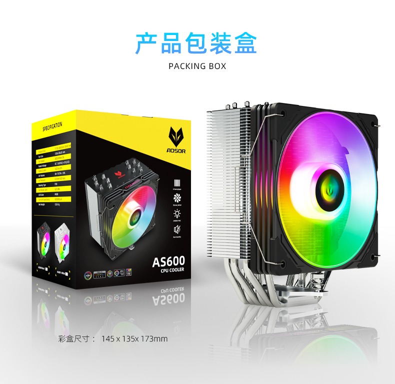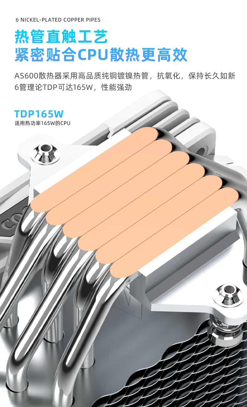 AS600 CPU散热器,采用镀镍6热管,加厚加粗鳍片,并搭配高转速2000转左右的温控风扇,ARGB神光同步,配有多平台安装扣具和导热硅脂,支持1851/1700/115X/AMD等系列CPU,更多咨询,请联系我们!
