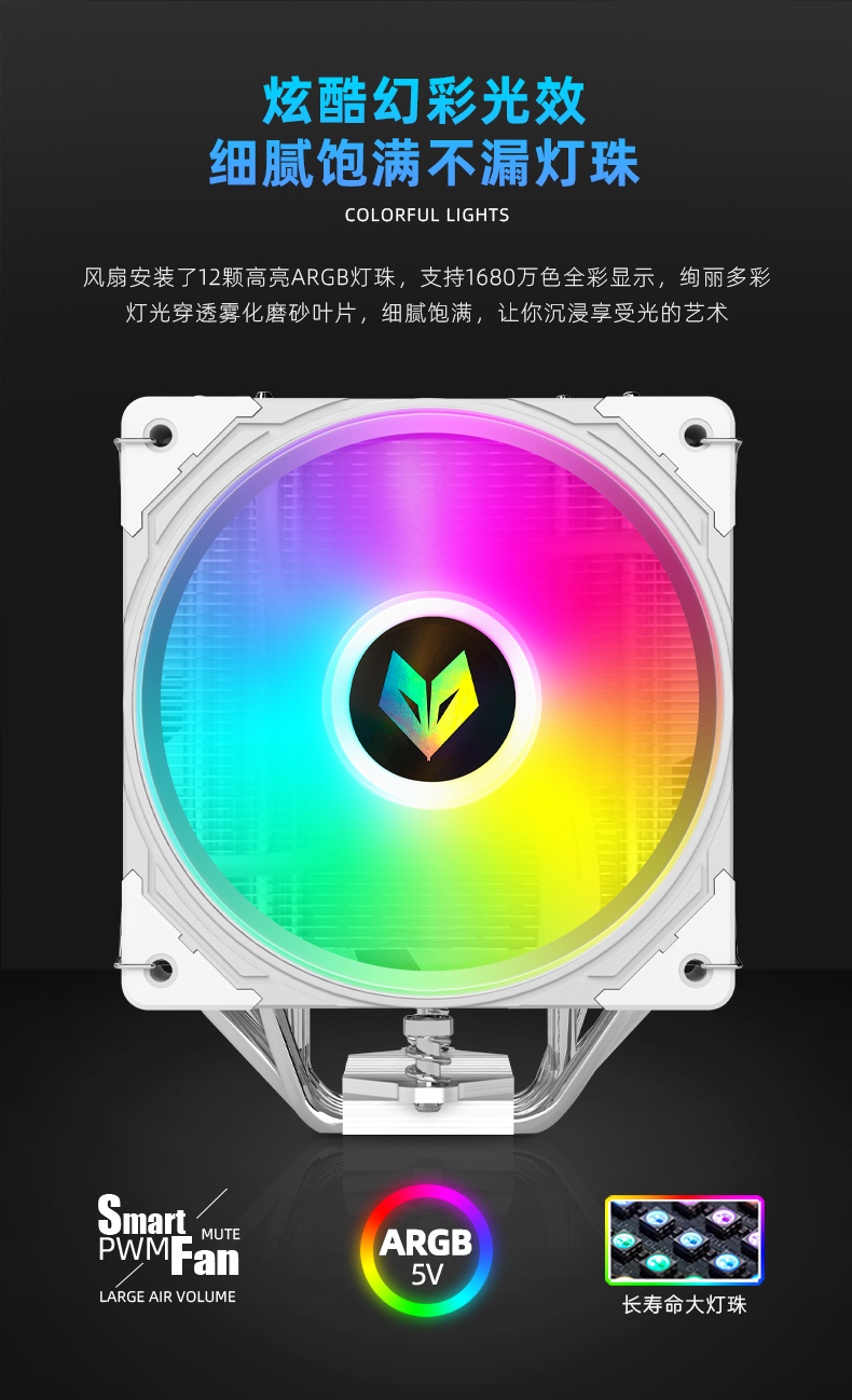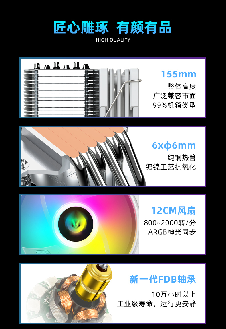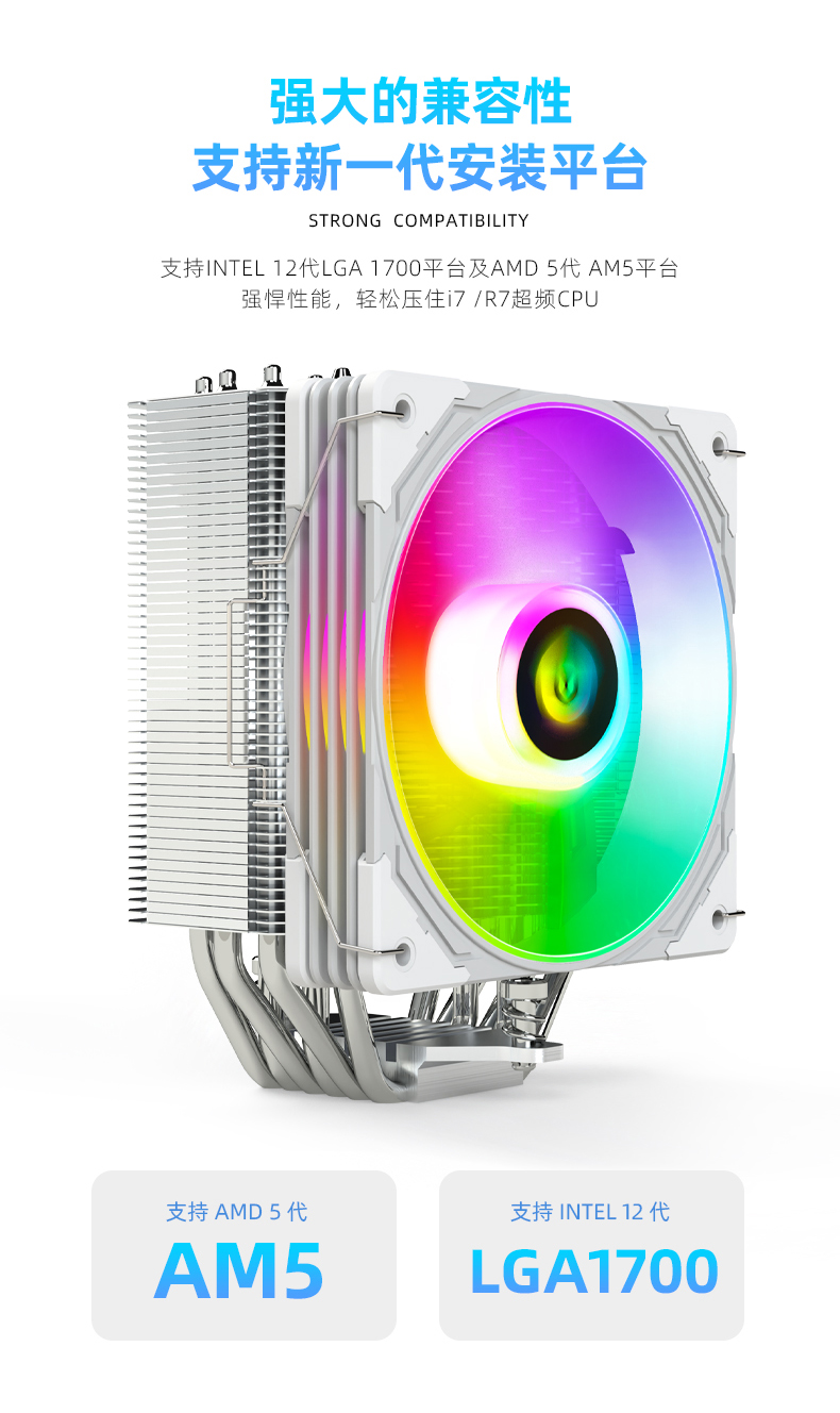 AS600 CPU散热器,采用镀镍6热管,加厚加粗鳍片,并搭配高转速2000转左右的温控风扇,ARGB神光同步,配有多平台安装扣具和导热硅脂,支持1851/1700/115X/AMD等系列CPU,更多咨询,请联系我们!