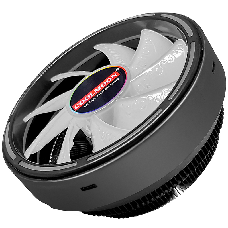 COOLMOON缤纷CPU散热器,采用下压式散热设计,12CM大风扇,强劲直吹散热,RGB自动幻彩变色,高密度散热鳍片,多平台安装!