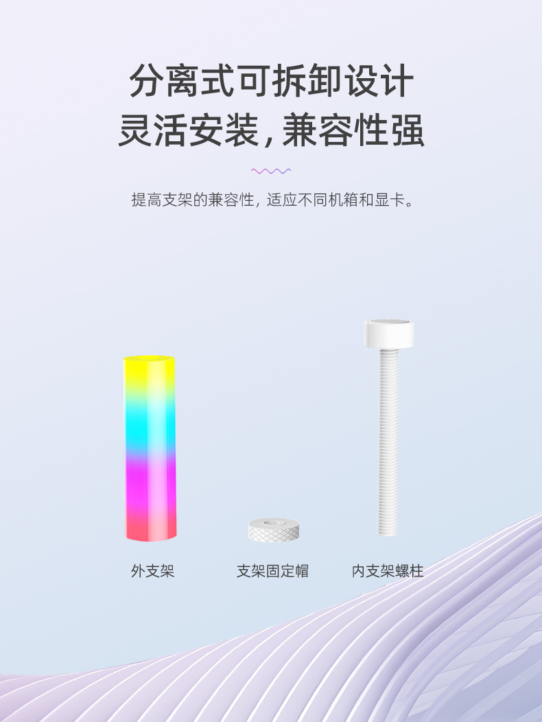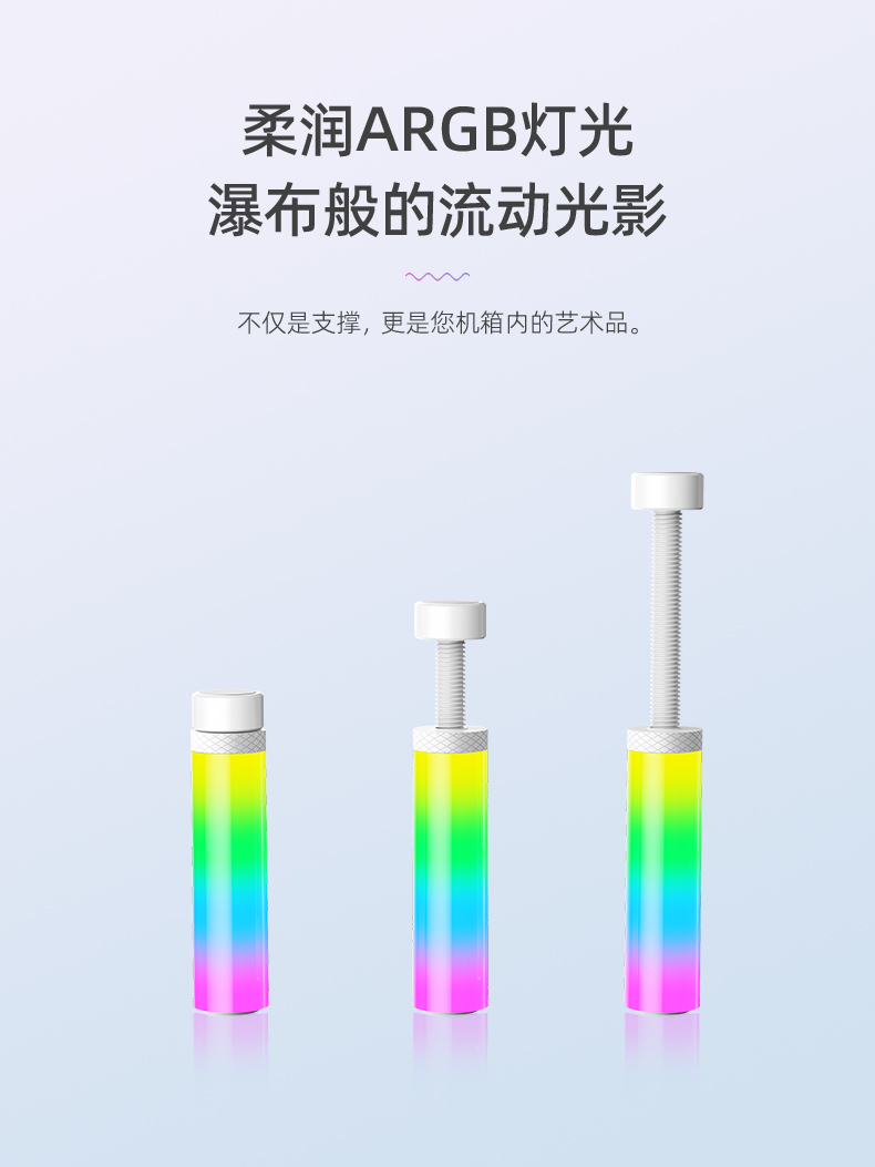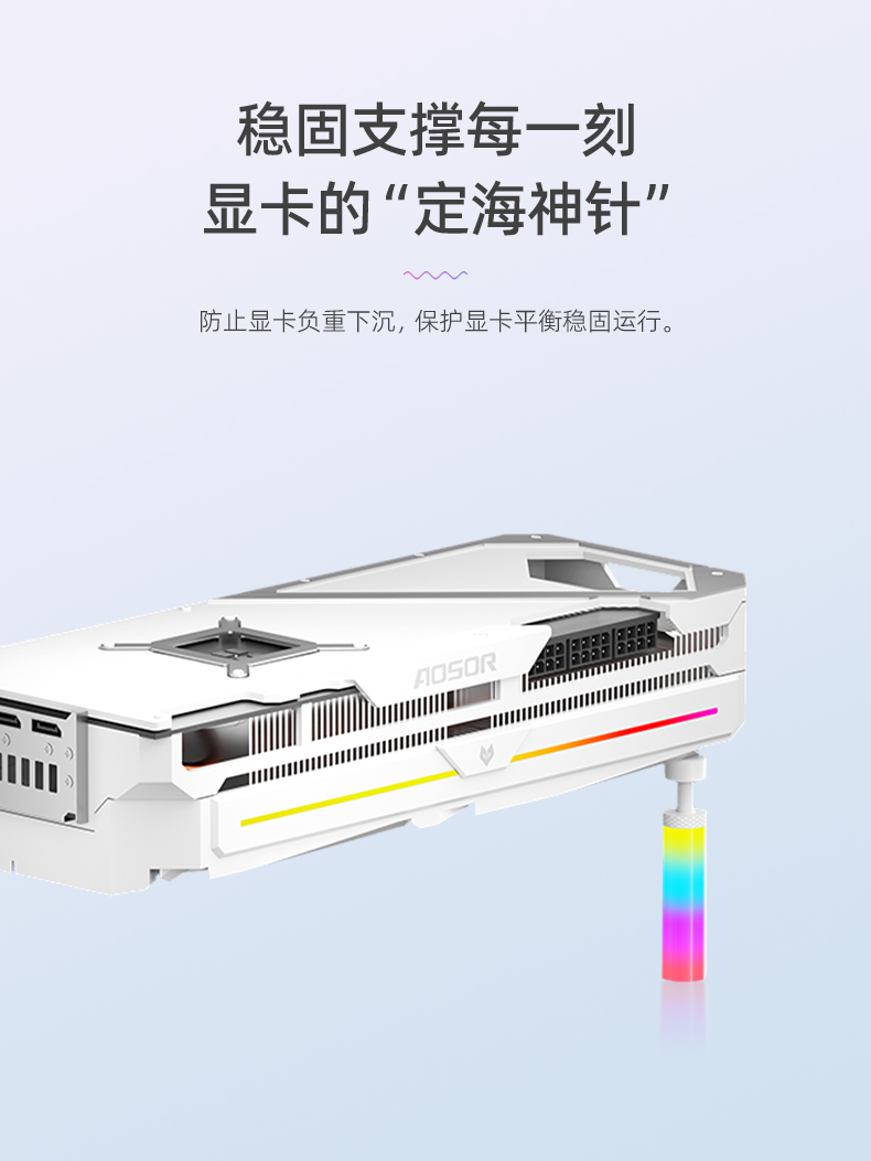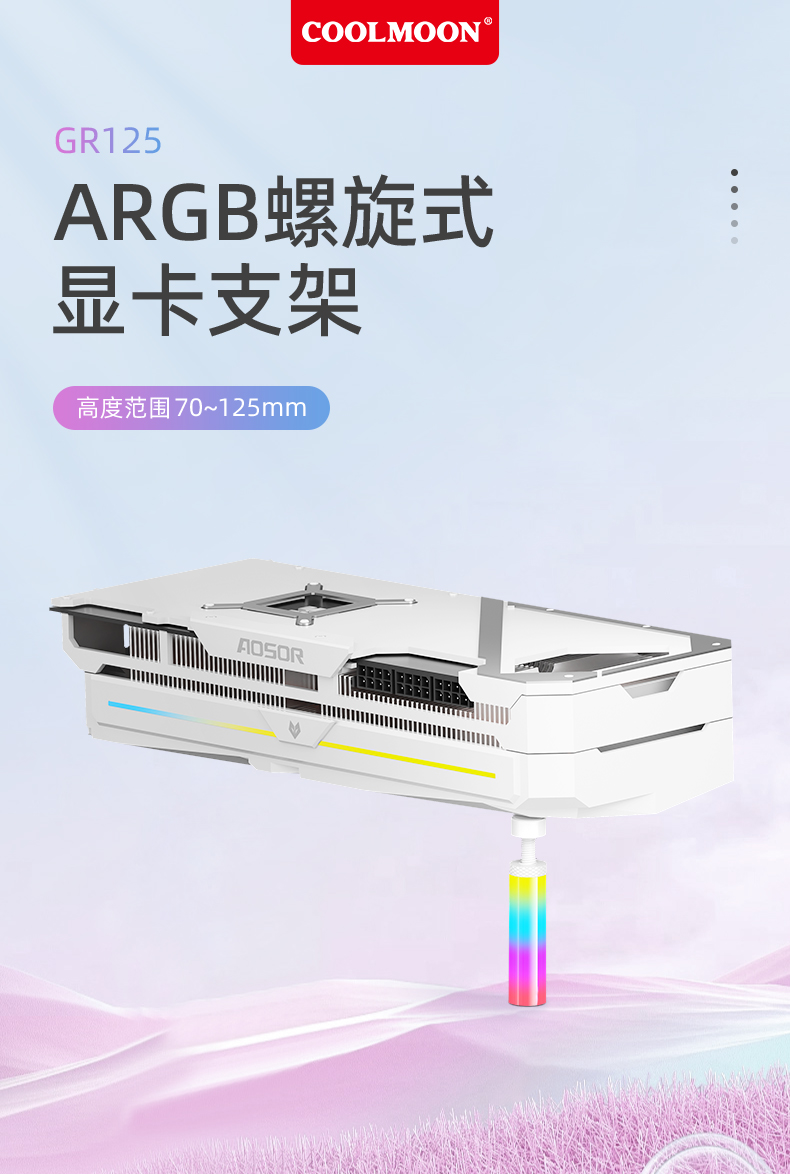 GR125显卡支架,ARGB神光同步,炫酷灯光由您掌控,底部磁吸固定,螺旋式上下高度可调节,迷你机身,强力支撑显卡,保护显卡不变形!