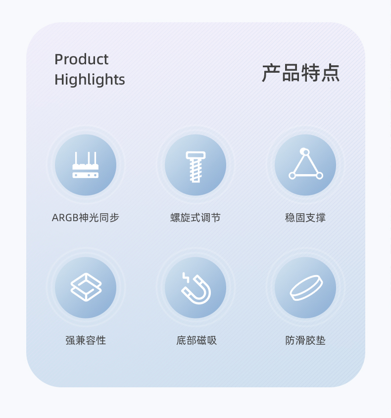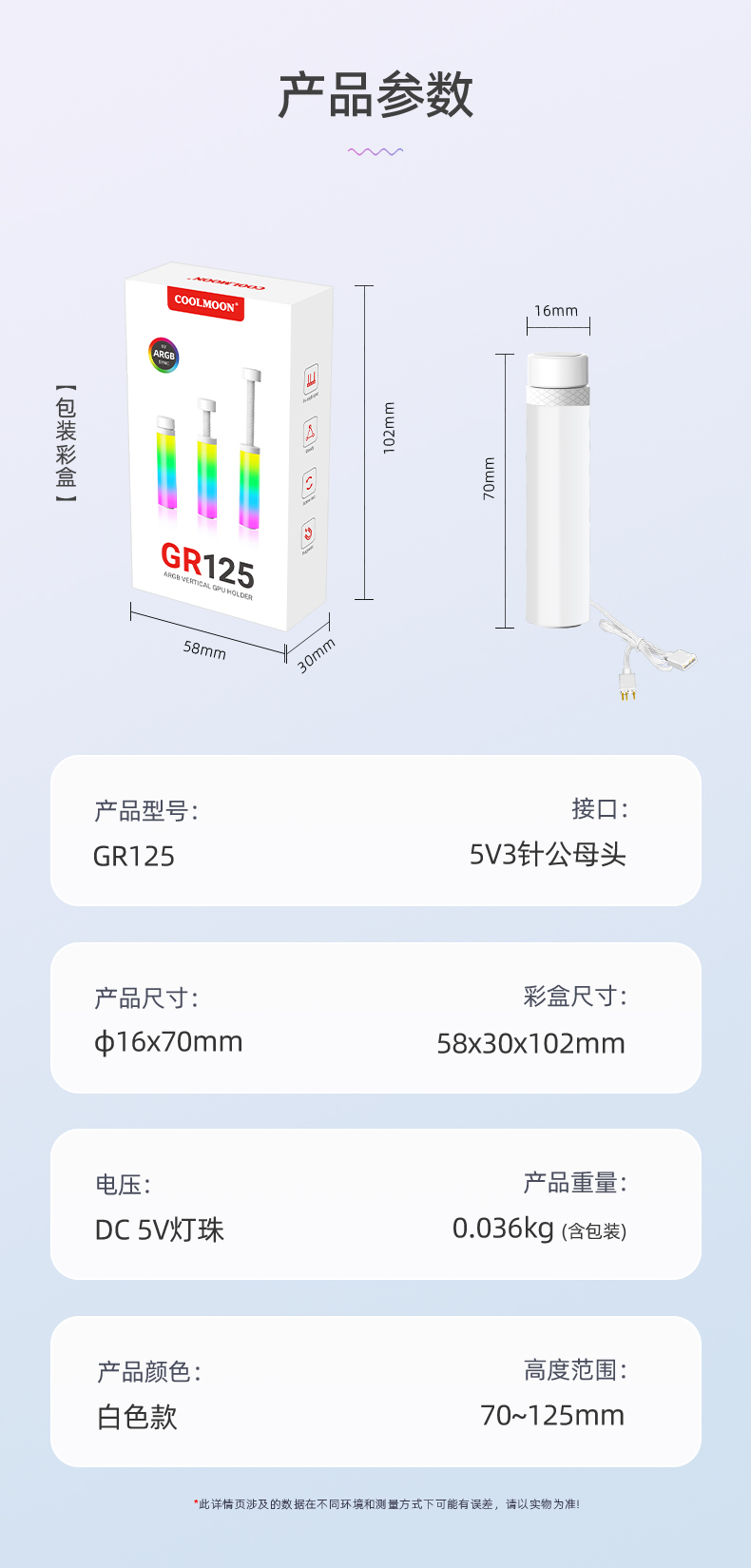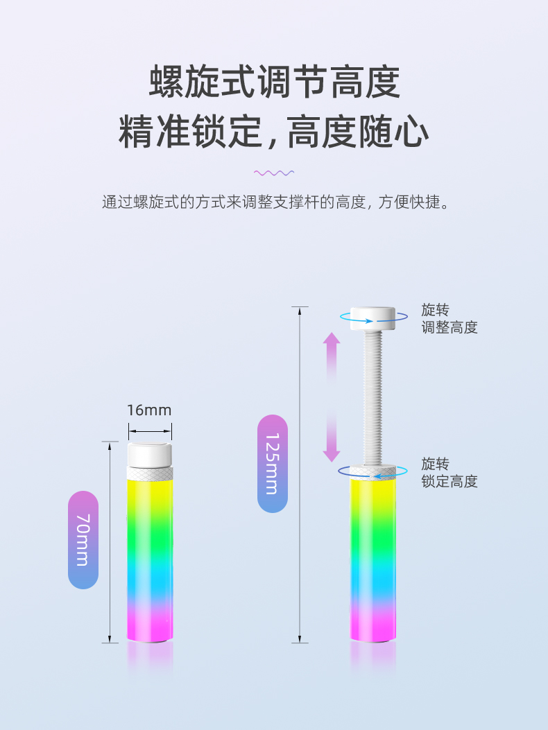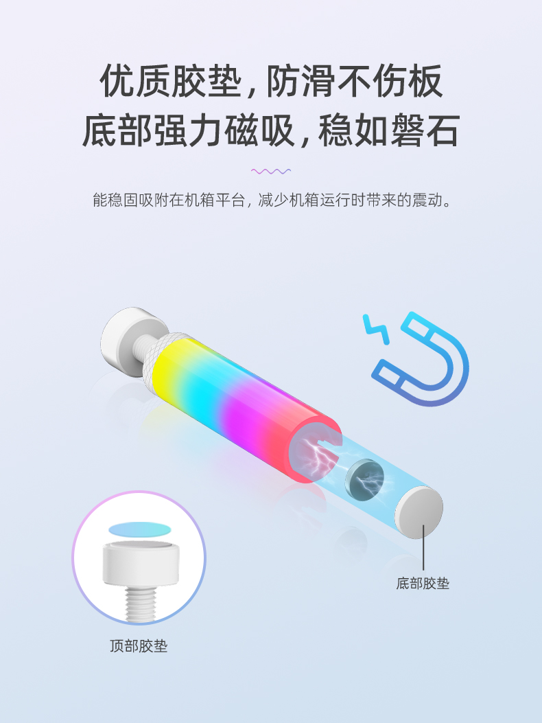 GR125显卡支架,ARGB神光同步,炫酷灯光由您掌控,底部磁吸固定,螺旋式上下高度可调节,迷你机身,强力支撑显卡,保护显卡不变形!