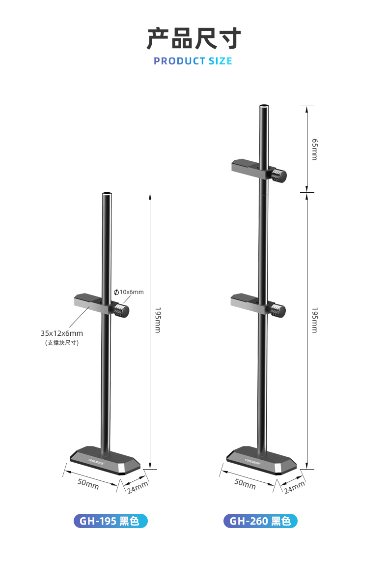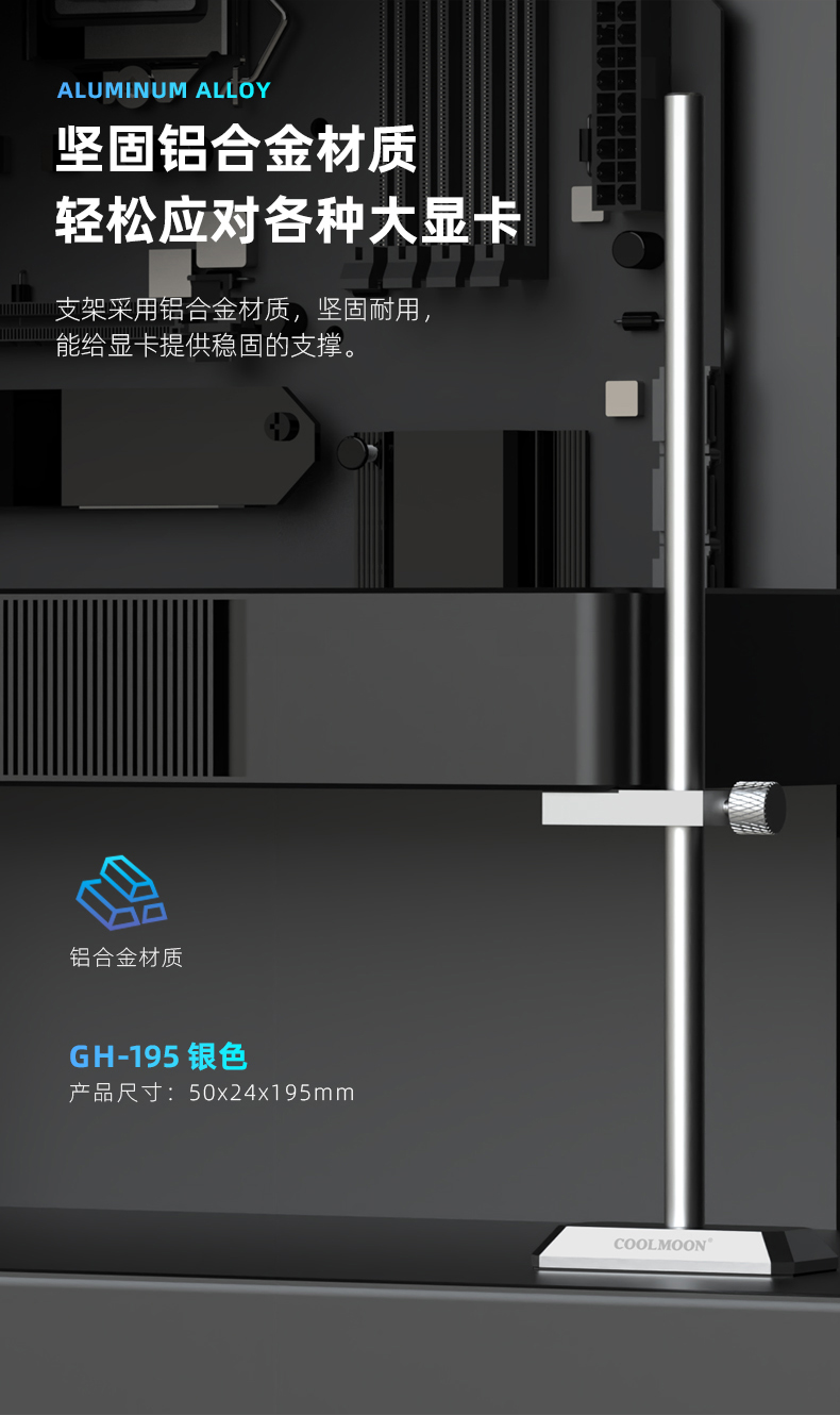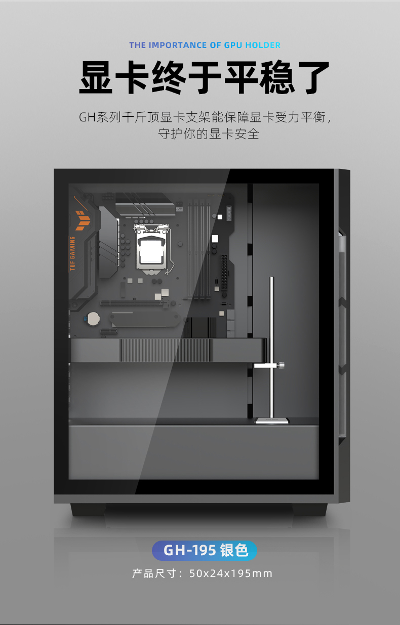 GH195立式显卡支架,铝合金金属材质,上下高度可调节,底部磁吸固定,立式支撑,强力保护显卡不变形!