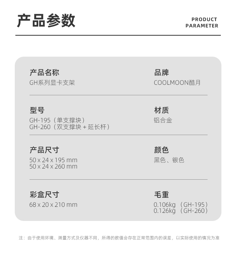 COOLMOON酷月 GH260双杆显卡支架台式电脑显卡伴侣竖装托架铝合金立式磁吸GPU显卡支撑架