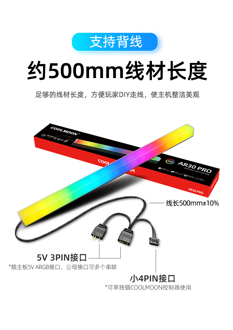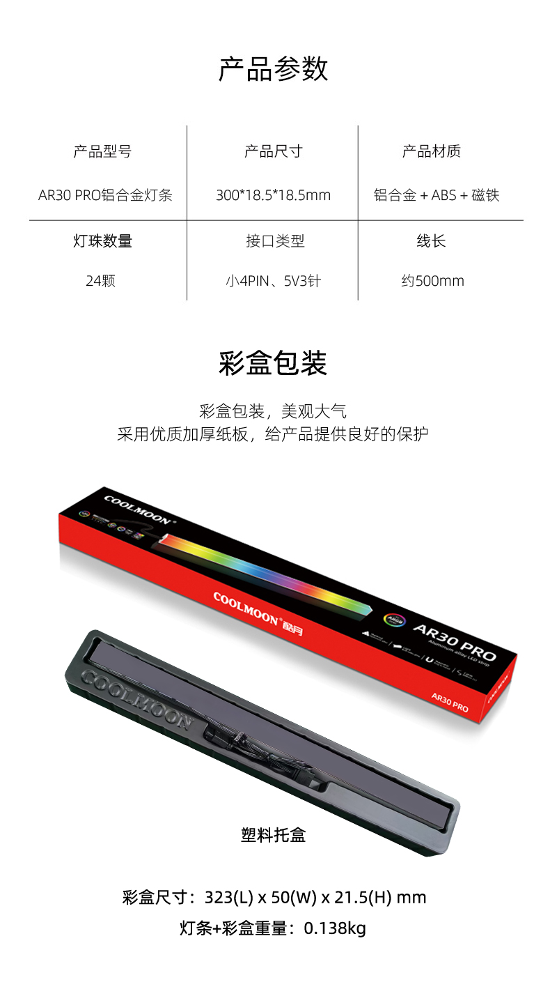 COOLMOON酷月 AR30铝合金磁吸灯条,双面发光,支持主板ARGB神光同步,磁吸设计,轻松吸附机箱,独立彩盒包装,大量现货供应!